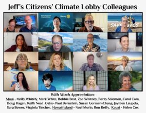 Jeff was a board member of the Maui Economic Development Board (MEDB) for a number of years. He was a participant in the Maui Business and the Environment Conferences (BEACON) in the early 90s. He was part of the founders of the Maui Recycling Group, a non-profit that helped to launch recycling in the County of Maui; and Zero Waste Maui; as well as the Citizens Climate Lobby and other community-based organizations.